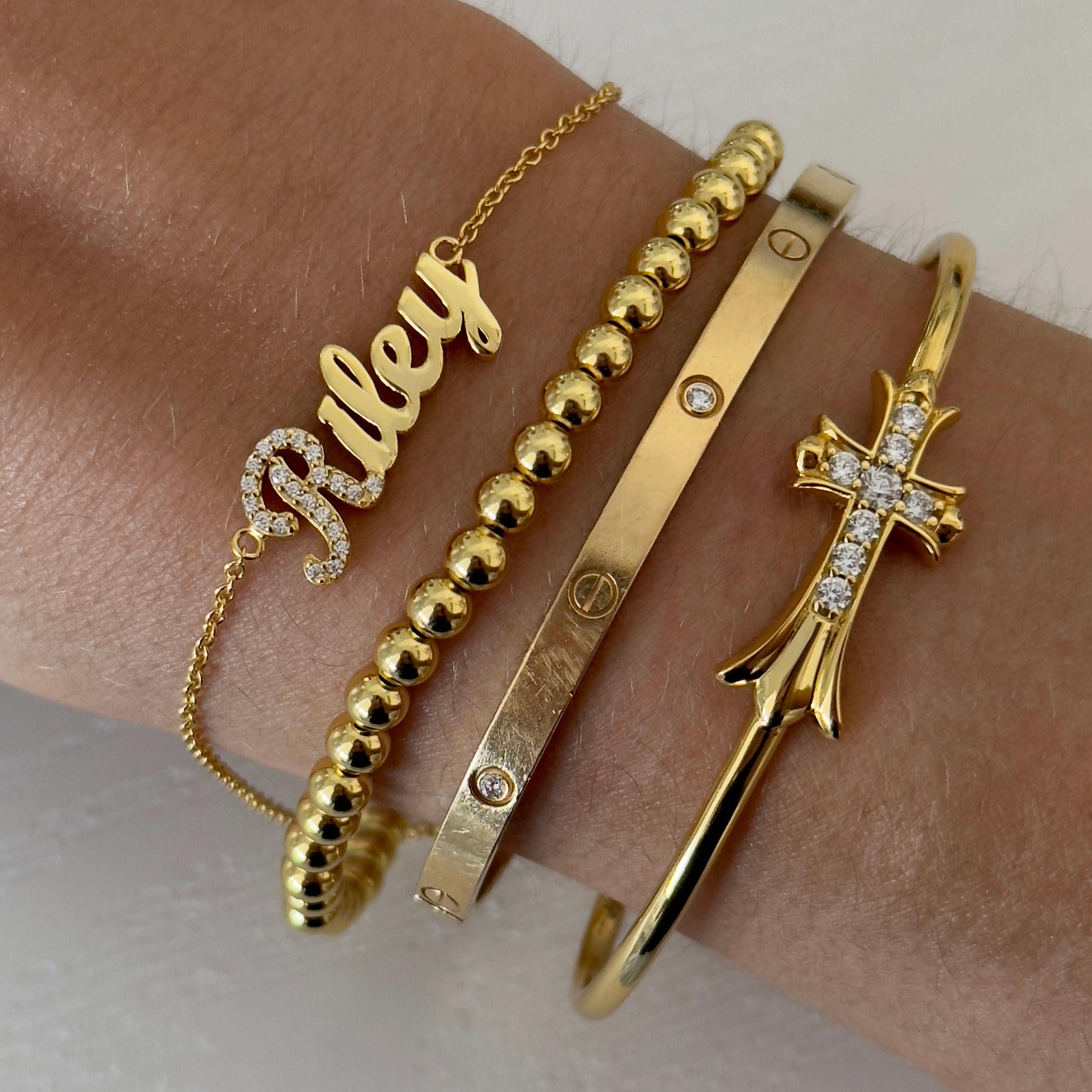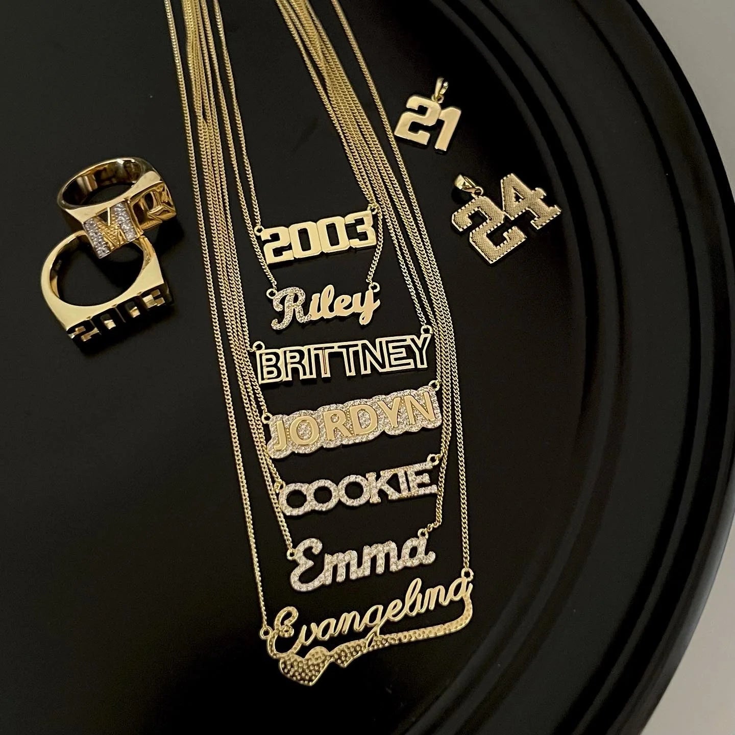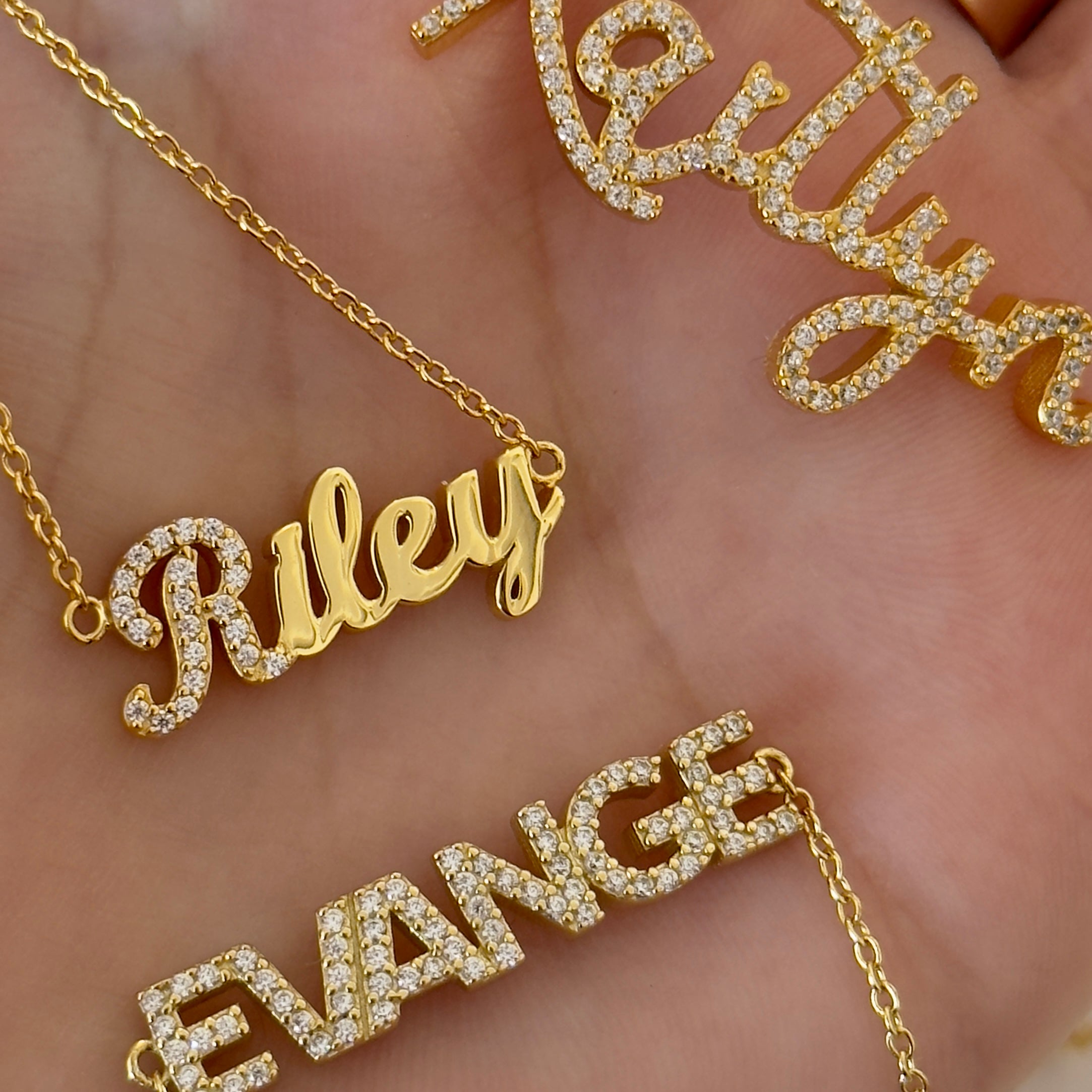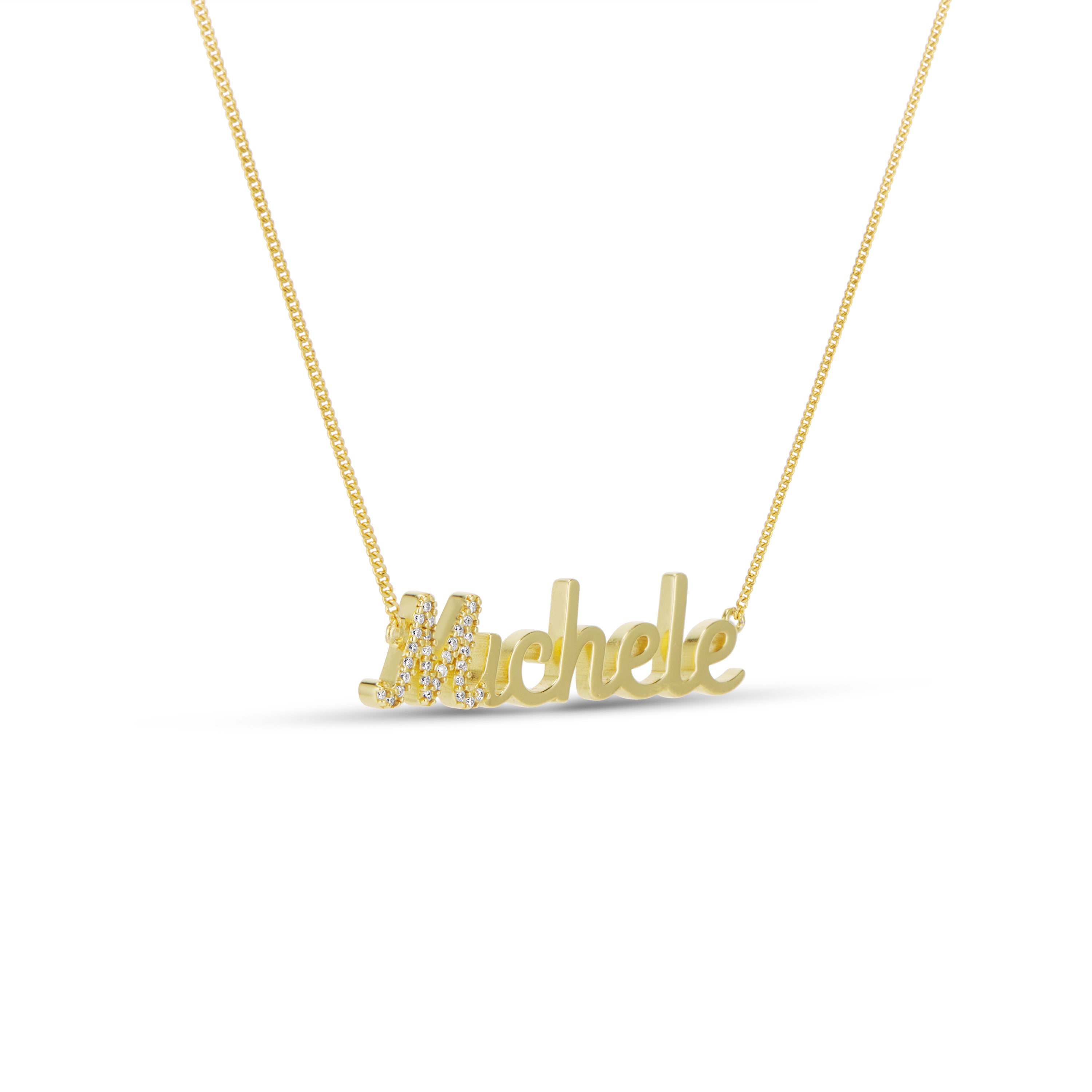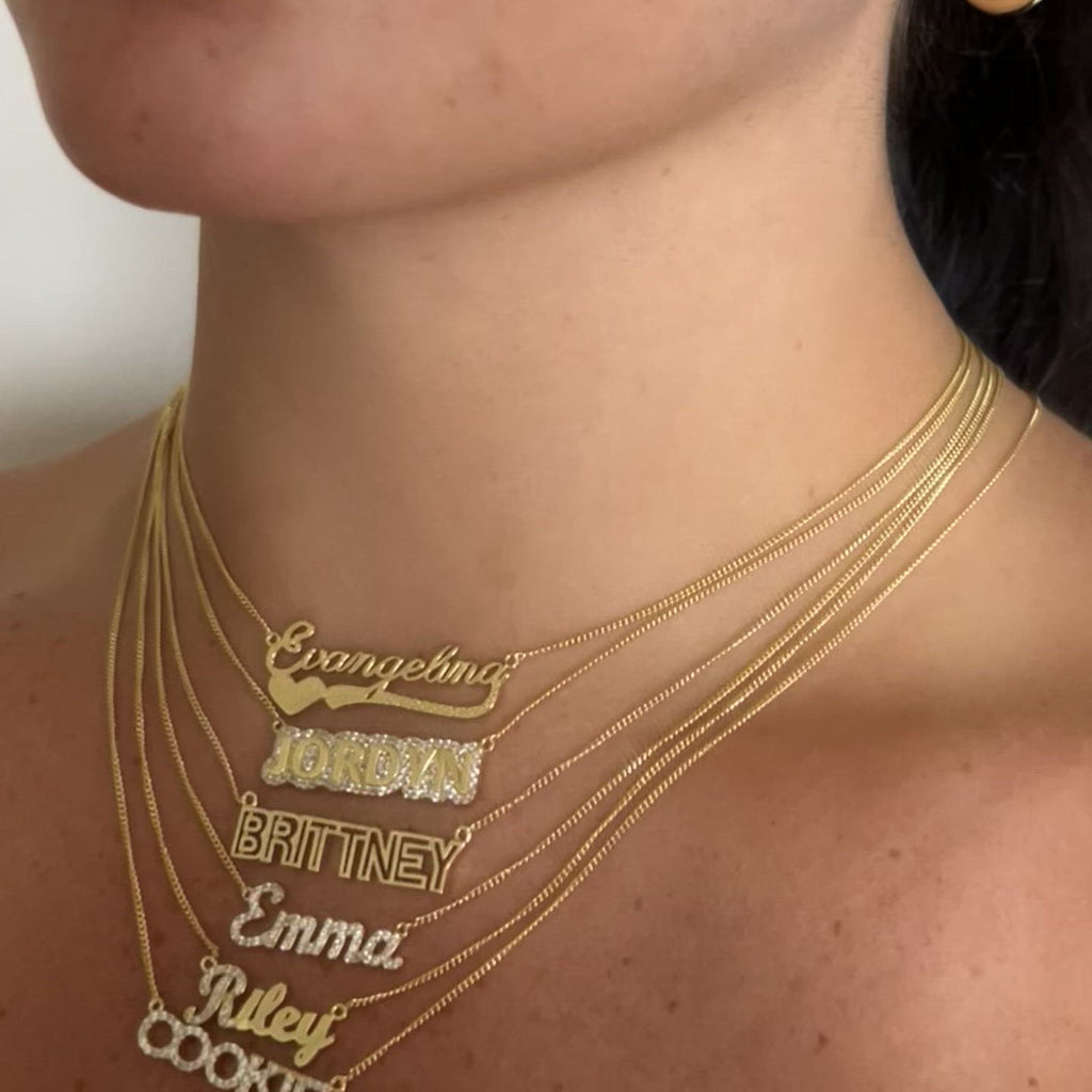 Introducing our custom name collection, crafted with 925 sterling silver and available in your choice of 14k gold plating or rhodium plating. We offer 9 design options for you to choose from. Personalize yours with your name or a special word and enjoy a unique and fashionable accessory.